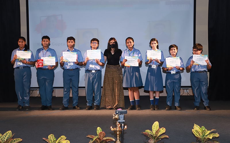 Recognition Day is an annual occasion where students are awarded for their hard work, perseverance and determination. Khaitan Public School celebrated Recognition Day on 27th of April where Middle School students were recognised for excellence in academic rigour as well as co-curricular activities. The event, which was conducted online, began on an auspicious note with the chanting of Sanskrit shlokas to invoke the blessings of Goddess Saraswathi and Lord Ganesh. The Education Director, Ms. Mamta Kapoor, warmly welcomed all to the threefold recognition of the children, parents, and teachers for their pursuit of brilliance. The principal, Ms. Claire White, addressed the august gathering and congratulated the students on their astounding achievements.